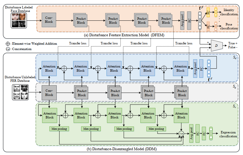由我中心硕士生阮德莲完成的论文“Deep Disturbance-Disentangled Learning for Facial Expression Recognition” 被ACM MM接收,论文框架如图2所示。该文考虑到人脸表情图像受到很多因素的干扰,如身份、性别、年龄、光照、姿态等,提出一种基于干扰分离学习的方法用于表情识别任务。首先利用其它人脸数据集中的干扰标签来训练一个干扰特征提取模型,再通过对抗性迁移学习的方法来将模型特征迁移到表情识别模型中。在表情识别模型中使用多任务学习的方式将表情特征和干扰特征解耦,得到更干净的表情特征。实验结果表明,该方法在5个公开的常用数据集上都达到了优异的表情识别效果。该论文由严严副教授、王菡子教授、厦门理工学院陈思副教授和伦敦大学学院薛景浩副教授共同指导。