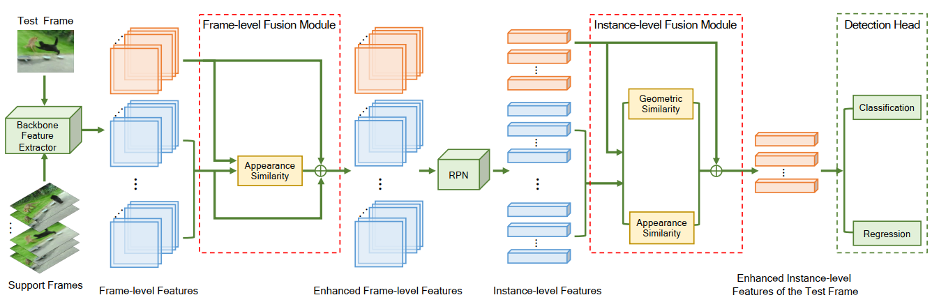 由我中心硕士生林丽健、博士生陈昊升以及硕士生梁俊合作完成的论文 “Dual Semantic Fusion Network for Video Object Detection”被ACM MM接收,论文框架如图1所示。该论文提出了一种基于双重语义融合的视频目标检测方法(DSFNet),用于同时在帧级别和物体实例级别融合视频中的特征,利用视频中丰富的时空信息来辅助每一帧的检测。该论文提出的方法利用深度神经网络实现,所提出的网络结构可以端到端训练。此外,该文提出了一种新的几何度量方式来减轻特征融合当中的由于噪声引起的信息失真问题。实验结果表明,该方法在视频目标检测公开数据集上达到了现有最高的精度。该论文由王菡子教授和腾讯PCG ARC的张宏伦博士、李昱博士、单瀛博士共同指导。