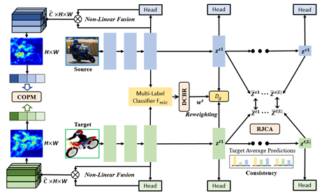 (3) 由硕士生陈超奇、郑泽镖合作完成的论文《I3Net: Implicit Instance-Invariant Network for Adapting One-Stage Object Detectors》主要解决由于域之间的分布差异导致跨域目标检测性能下降的问题,论文框架如图3所示。近来在双阶段跨域检测方面的工作已经广泛地探索了局部特征模式以实现更准确的域适应结果。这些方法严重依赖于区域提议机制和基于ROI的实例级特征来针对前景目标设计细粒度的特征对齐模块。但是,对于单阶段检测器来说,很难甚至不可能在检测流程中获得显式的实例级特征。为此,我们提出了一个隐式实例不变网络,该网络专门为适配单阶段检测器而设计,并通过利用不同层中深度特征的自然特性来隐式地学习实例不变特征。具体来说,论文从三个方面促进域适应:(a)动态和类平衡重加权策略(DCBR),该策略考虑了域内和类内变化的共存,以便将较大的权重分配给那些样本稀少的类别和容易适配的样本;(b)类别感知目标模式匹配模块(COPM),在类别信息的引导下,增强跨域前景目标的匹配,并抑制含有信息量较少的背景;(c)正则联合类别对齐模块(RJCA),该模块通过一致性正则化在多个特定于域的层上同时实现类别对齐。提出的方案在多个数据集上都达到了SOTA的效果。该论文由黄悦副教授(通信作者)、丁兴号教授和香港大学俞益洲教授共同指导完成。