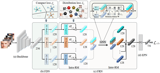 (1) 由硕士生阮德莲完成的论文《Feature Decomposition and Reconstruction Learning for Effective Facial Expression Recognition》主要解决人脸表情识别中严重的类间相似性问题,论文框架如图1所示。人脸表情信息由不同表情之间的共享信息和每个表情各自的特有信息组成。基于上述观察,该论文设计了一个基于特征解构与重构学习的人脸表情识别方法,分别用于学习表情信息中的共享信息和特有信息。具体地,该方法主要包括两个核心模块——特征解构学习模块和特征重构学习模块。其中,特征解构学习模块把由基础网络提取的基础特征分解为一系列潜在特征向量,这些潜在特征向量有效地建模了表情中的共享信息。然后,特征重构学习模块分别对这一系列潜在特征向量进行特征内部和特征之间的相关性建模,从而学习表情的特有信息。实验结果表明该方法在三个室内数据集(包括 CK+、 MMI 和 Oulu­CASIA)和两个室外数据集(包括 RAF­DB 和 SFEW)上都有优越的性能表现。该论文由严严副教授和王菡子教授、美团的赖申奇和柴振华博士、阿德莱德大学的沈春华教授共同指导。