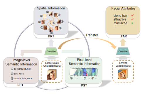 (2) 由硕士生疏颖完成的论文《Learning Spatial-Semantic Relationship for Facial Attribute Recognition with Limited Labeled Data》主要解决在标签不足情况下的人脸属性识别问题,论文框架如图2所示。随着深度学习的进展,人脸属性识别技术也获得了长足的进步。然而在现实生活中,人脸属性识别应用只能获得少量的有标签数据,这大大降低了识别的性能。为了解决这一问题,该论文利用多任务训练方式,根据人脸属性的特点设计了三个不同的学习分支,充分挖掘人脸图像中的空间信息和语义信息,在标签不足的情况下也同样获得了很好的识别精度。这项研究有较好的应用前景和现实意义,在保有精度的同时可以减少对于数据标签的依赖,因此更加符合现实应用场景的需求。该论文由严严副教授和王菡子教授、厦门理工学院的陈思副教授、伦敦大学学院的薛景浩副教授和阿德莱德大学的沈春华教授共同指导。