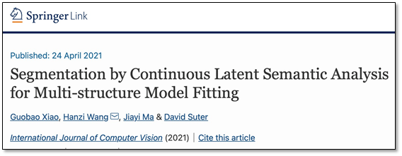 Springer出版集团旗下International Journal of Computer Vision国际期刊,近日发表我中心王菡子教授课组的论文《Segmentation by Continuous Latent Semantic Analysis for Multi-structure Model Fitting》, DOI:10.1007/s11263-021-01468-6。