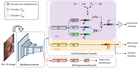 由我中心硕士生莫榕云完成的论文《D3Net: Dual-Branch Disturbance Disentangling Network for Facial Expression Recognition》被ACM MM接收,论文框架如图所示。人脸表情图像中存在常见干扰因素(如身份、光照、姿态等)和潜在干扰因素(如发型、配饰、遮挡等)。该论文提出了一种基于多任务框架的双分支干扰分离的人脸表情识别方法(D3Net),包括表情分支和干扰分支,可以同时分离常见干扰特征和潜在干扰特征,提取更有效的表情特征。其中,干扰分支包含两个子分支。一个子分支利用其它人脸数据集的干扰标签和迁移学习的方式来训练,可以提取常见干扰特征。另一个子分支结合非参数贝叶斯先验——印度自助餐过程(IBP)先验,以无监督的方式学习潜在干扰特征。同时,该方法通过对抗训练来区分干扰特征和表情特征。最后,优化联合损失,促使表情分支更专注于提取高判别力的表情特征。实验结果表明,该方法在3个室内数据集和2个室外数据集上都达到了优越的识别性能。该论文由严严副教授、王菡子教授、伦敦大学学院薛景浩副教授和厦门理工学院陈思副教授共同指导。