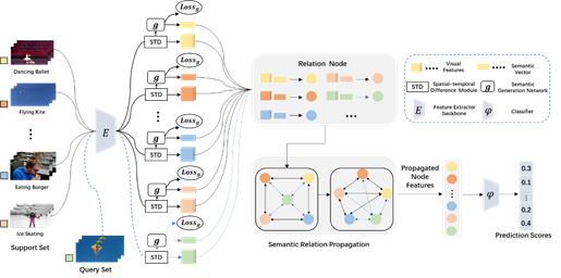 由我中心博士生王晓、硕士生叶伟荣完成的论文《Semantic-Guided Relation Propagation Network for Few-shot Action Recognition》被ACM MM接收,论文框架如图所示。小样本行为识别任务最大的难点就是训练样本不足,一些深度学习方法在该任务上无法发挥其优势,导致无法获得较好的训练模型。由于训练样本较少,学习到的相近的类的视觉特征非常相似,导致无法正确区分这两类。因此,该论文提出了一种语义引导的关系传播网络小样本行为识别方法。通过引入利用样本的标签信息去监督网络进行学习。当训练样本较少时,语义信息可以辅助网络学习更具有判别力的信息。然而,对于特别复杂的相似类,仅仅使用语义信息还是不能够很好的进行视频分类。考虑到视频序列里面含有丰富的时序信息,该文提出了时空差异性模块来提升对视频的视觉特征学习能力。实验结果表明,该方法在3个数据集都达到了优越的行为识别性能。该论文由王菡子教授、腾讯PCG应用研究中心(ARC)主任单瀛、高级研究员祁仲昂、赵珣共同指导。