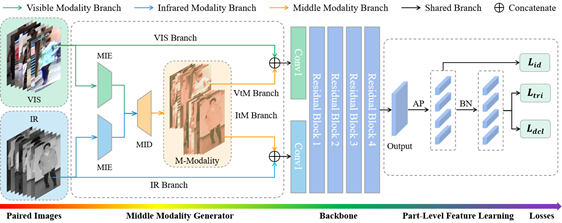 由我中心博士生张玉康完成的论文《Towards a Unified Middle Modality Learning for Visible-Infrared Person Re-Identification》被ACM MM接收,论文框架如图所示。跨模态行人重识别中主要的难点在于白天的彩色行人图像和夜间的灰度图像行人图像之间的模态差异。该论文提出了一种基于统一中间模态网络的跨模态行人重识别方法(MMN),包括中间模态生成器和分布差异损失,中间模态生成器首先将两个模态的图像分别输入到两个参数不共享的通道层面的编码器进行编码,接下来将其输入到一个共享的解码器中生成统一的中间模态图像,中间模态图像与原始图像一起输入到网络中用于辅助原始图像学习有效的特征表征。为了进一步的降低模态差异、拉近两种中间模态图像之间的距离,该论文提出了一个分布差异损失,有效的改善了模型的性能。实验结果表明,该方法在2个常用的跨模态行人重识别数据集上都达到了最好的性能。就rank1而言,超越了现有方法10%以上。该论文由王菡子教授、严严副教授、卢杨老师共同指导。