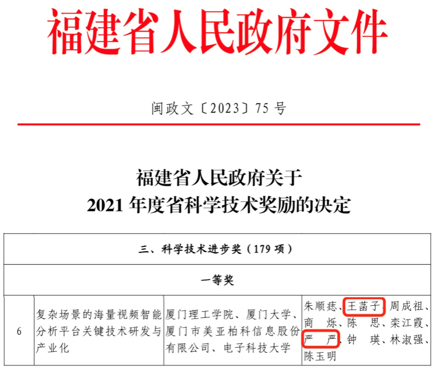 日前,福建省人民政府公布了2021年度福建省科学技术奖获奖名单,全省共获科学技术进步奖179项,一等奖23项,二等奖57项,三等奖99项。其中,由厦门大学联合厦门理工学院、厦门市美亚柏科信息股份有限公司、电子科技大学共同申报的《复杂场景的海量视频智能分析平台关键技术研发与产业化》项目荣获“福建省科学技术进步奖一等奖”。 该项目主要完成人包括我中心的王菡子教授和严严教授。该项目已在福建、云南、宁夏、内蒙古、贵州、广东等省市落地应用,并得到中央网信办、工信部等国家部委的高度认可。