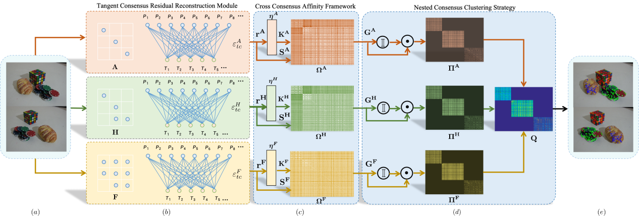 简介:本文的第一作者是厦门大学信息学院2023级博士生尹文玉,通讯作者是卢杨助理教授,由王菡子教授、林舒源博士(暨南大学)共同合作完成。多模型拟合存在大量噪声和异常数据,仅使用单一一致性或隐式融合模型来模拟数据点和模型假设之间的相关性往往会导致不正确的模型拟合。本文提出了一种基于多样一致性配对与运动估计的多模型拟合(CMMF)方法,该方法利用三种不同的一致性以及模型间的协作来提高多模型拟合的有效性。我们设计了一个切线一致性残差重建(TCRR)模块,用于在像素级捕获两点的运动结构信息。此外,我们引入了交叉一致性亲和度(CCA)框架,以加强数据点和模型假设之间的相关性。为了应对多体运动估计的挑战,我们提出了一种嵌套一致性聚类(NCC)策略,该策略将多模型拟合转化为运动估计问题。它明确地建立了模型之间的运动协作,并确保了多个模型良好拟合。