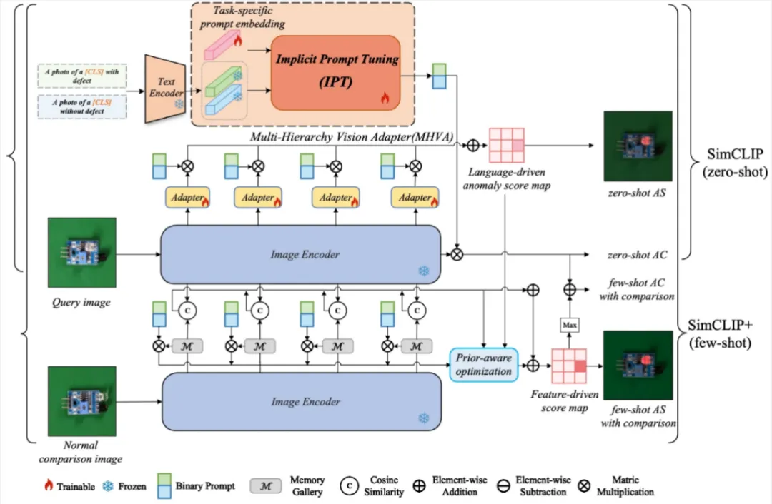 简介:本文的共同第一作者是人工智能研究院2022级硕士生邓成浩和徐浩特博士,通讯作者是涂晓彤助理教授,由丁兴号教授、黄悦教授等共同合作完成。最近,经过大规模Web数据完成预训练的视觉语言模型,在小零样本异常检测领域内展现出了优越的性能表现。然而,现有方法仍然存在两个问题。第一,文本提示需要通过大量的专家知识来构建。第二,当前的方法使用不对齐的高层语言特征和低层视觉特征来完成异常分割任务。基于此,本文提出了一个名为SimCLIP的方法,旨在通过多层级的视觉适配器(MHVA)和隐式提示学习模块(IPT)之间的双向适应来修正视觉语言特征不对齐的问题。SimCLIP只需简单的二分类文本提示就能高效完成零样本异常检测任务。此外,本文还提出了它的扩展版本SimCLIP+,通过整合视觉嵌入信息和跨模态协同信息来解决小样本场景下的异常检测任务。本文为预训练视觉语言模型高效适配具体的下游小零样本异常检测任务提供了新的视角。