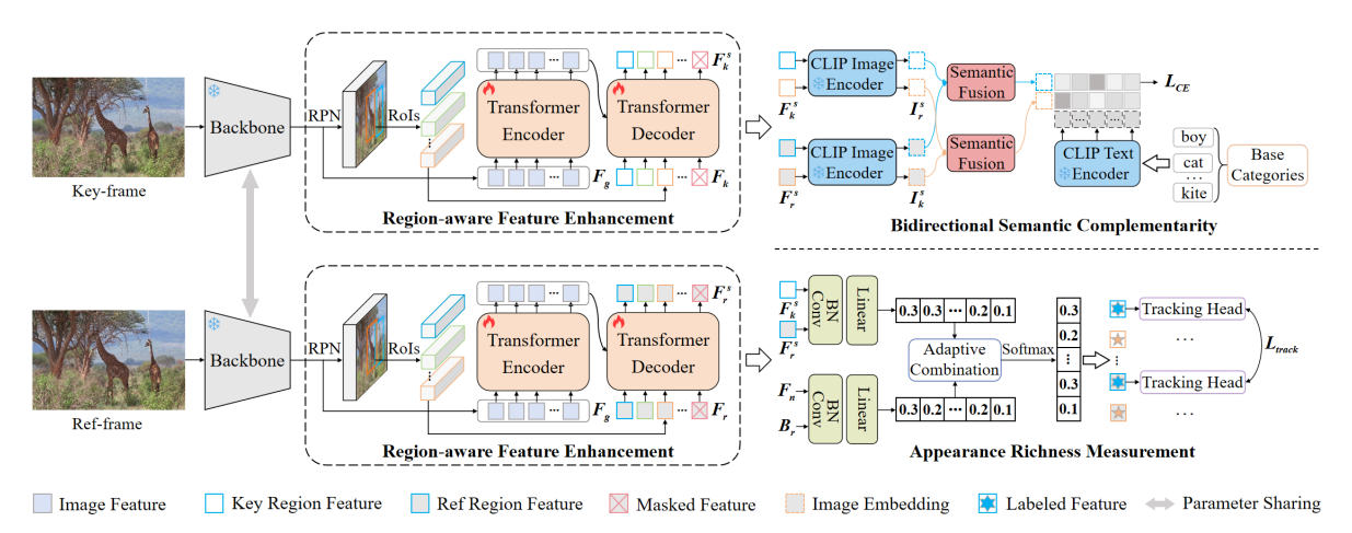 简介:本文的第一作者是厦门大学人工智能研究院2023级博士生黎光耀,通讯作者是王菡子教授,由2022级硕士生简亚军、严严教授共同合作完成。针对开放词汇多目标跟踪在复杂环境中目标外观表征不明确、语义信息损失等关键问题,拟研究基于全局和局部感知的开放词汇多目标跟踪算法。该方法通过引入区域感知特征增强(RFE)模块细化全局知识来补充局部目标信息,增强语义表示并弥合图像特征图与区域特征之间的分布差距;提出双向语义互补(BSC)策略,在知识蒸馏过程中动态选择参考帧中的有价值信息,缓解关键帧中目标信息缺失导致的语义错位问题;引入外观丰富度测量(ARM)模块,为具有不同外观的目标提供适当的表示。提高模型的跟踪性能。