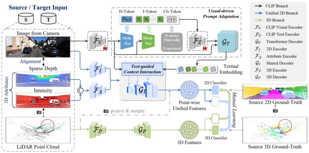 简介:本文的第一作者是信息学院2021级博士生吴垚,通讯作者是其导师曲延云教授和谢源教授(华东师范大学),由2022级硕士生邢明炜、张亚超(清华大学深圳研究院)等共同合作完成。本文探索了如何利用多模态信息解决3D语义分割的域自适应问题。现有的方法通常试图通过对齐源数据和目标数据之间的特征来减轻域差异。然而,这种实现在应用于图像感知时存在不足,因为与点云相比,图像对环境变化的敏感性更高。为了解决这一问题,本文提出一种利用图像语言预训练模型(CLIP)的先验知识来提升跨域3D语义分割鲁棒性的框架 (CLIP2UDA)。首先,引入了一个视觉驱动的提示适应模块 (VisPA),通过预训练的视觉编码器生成的2D域特征,学习特定于任务的文本提示。其次,为了学习多模态域不变特征表示,提出了一个文本指导的上下文交互模块 (TexCI),通过跨解码器层进行类感知融合和语义感知融合,得到文本引导的视觉特征,然后将该特征与图像和属性特征融合,并在共享解码器中进行层次性交互,从而产生联合的视觉预测。最后,将3D特征与点级联合特征进行互学习,受益于视觉语言结构相关性,增强了多模态域不变特征的表示能力。该方法在Day/Night、USA/Singapore、vKITTI/sKITTI和A2D2/sKITTI自适应场景中显著优于目前最先进的跨模态UDA方法。