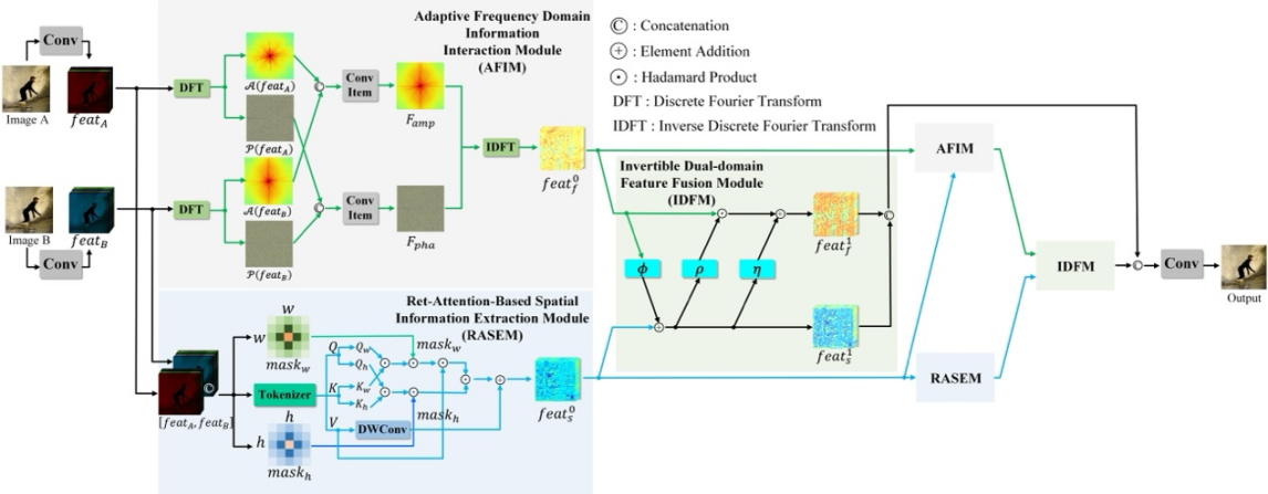 简介:本文的第一作者是信息学院2022级硕士生黄婧嘉,通讯作者是涂晓彤助理教授,由丁兴号教授、黄悦教授等合作完成。多焦点图像融合(MFIF)旨在将多个具有不同聚焦区域的图像合并成一张全聚焦图像。现有的无监督深度学习方法仅在空间域内融合图像的结构信息,忽略了在频域探索可能的潜在解决方案。本文首次尝试集成空域和频域的图像信息以实现高质量的MFIF。本文提出了一种新颖的无监督空-频双域交互MFIF网络,名为SFIMFN,它由三个关键组件组成:自适应频域信息交互模块(AFIM)、基于Ret-Attention的空间信息提取模块(RASEM)和可逆双域特征融合模块(IDFM)。具体来讲,在AFIM中,通过结合多张图像的幅值和相位信息,交互式地探索全局上下文信息。在RASEM中,通过显式设计具有2D衰减自注意机制的定制Transformer,鼓励网络捕捉重要的局部高频信息。最后,IDFM在信息无损的原则下融合空-频双域信息,生成全聚焦图像。在不同数据集上的大量实验表明,本文方法在定性和定量指标以及泛化能力上均显著优于最新的无监督方法。
