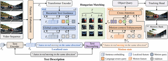 简介:本文提出了一种新颖的语言引导多目标跟踪方法 DKGTrack,通过将自然语言表达解耦为局部描述与运动状态两部分,有效提升了模型对语言细粒度信息的理解能力,从而实现更精确的目标定位与持续跟踪。为增强语言引导下的目标识别能力,本文设计了静态语义增强模块(SSE),通过分层的跨模态特征交互机制强化区域级视觉语言对齐,获得更具判别性的目标表示;同时,提出的运动感知对齐模块(MPA)建模语言中的动态描述与目标轨迹之间的对应关系,提升了跨帧跟踪的一致性。该方法在多个RMOT基准上均取得了优异表现,验证了其在复杂场景中稳健跟踪能力。